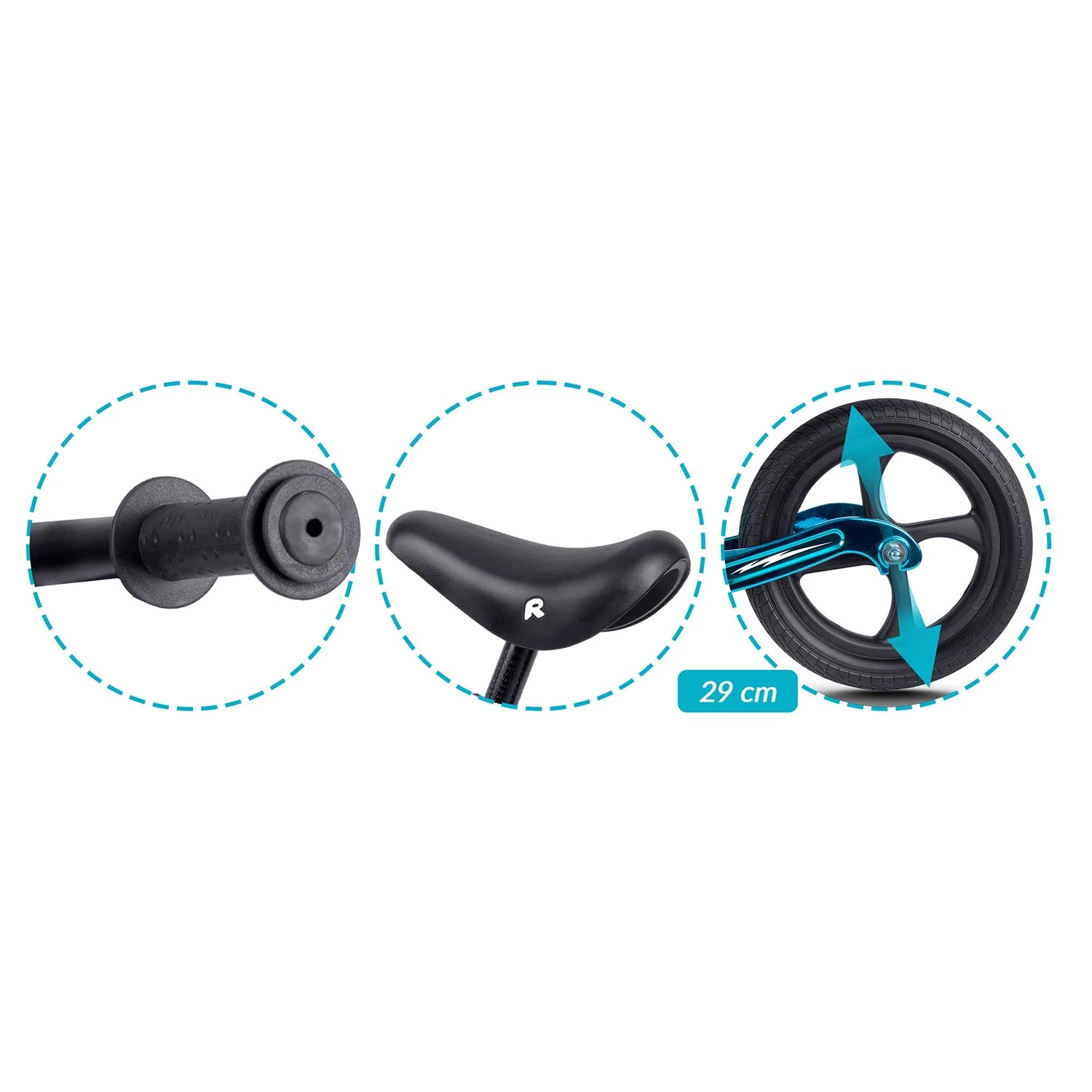 • Koła: duże, solidne koła z pianki EVA z wytrzymałymi oponami, zapewniające stabilność i płynność jazdy. Cicha praca podczas jazdy sprawia, że rowerek nie jest uciążliwy dla ucha nawet podczas jazdy w domu.