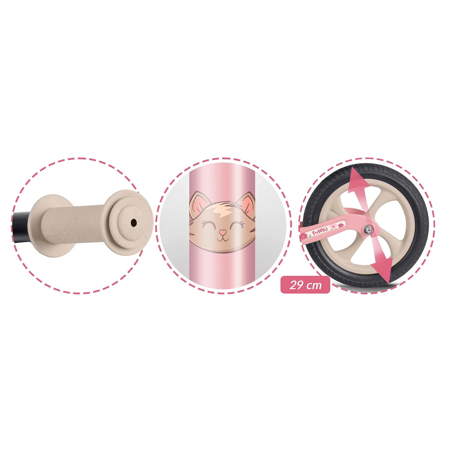 • Koła: duże, solidne koła z pianki EVA z wytrzymałymi oponami, zapewniające stabilność i płynność jazdy. Cicha praca podczas jazdy sprawia, że rowerek nie jest uciążliwy dla ucha nawet podczas jazdy w domu.