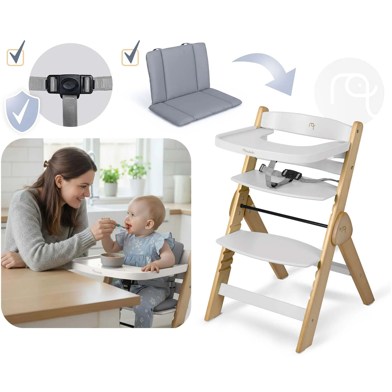 Dzięki specjalnemu zestawowi z pasami bezpieczeństwa i wygodną poduszką staje się bezpiecznym i komfortowym pierwszym krzesełkiem dla Twojego maluszka. Idealne do pierwszych posiłków i wspólnych chwil przy stole.