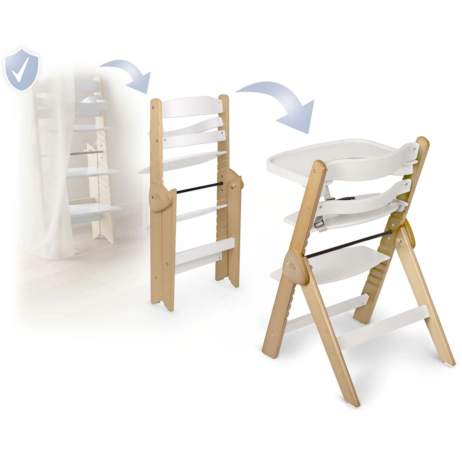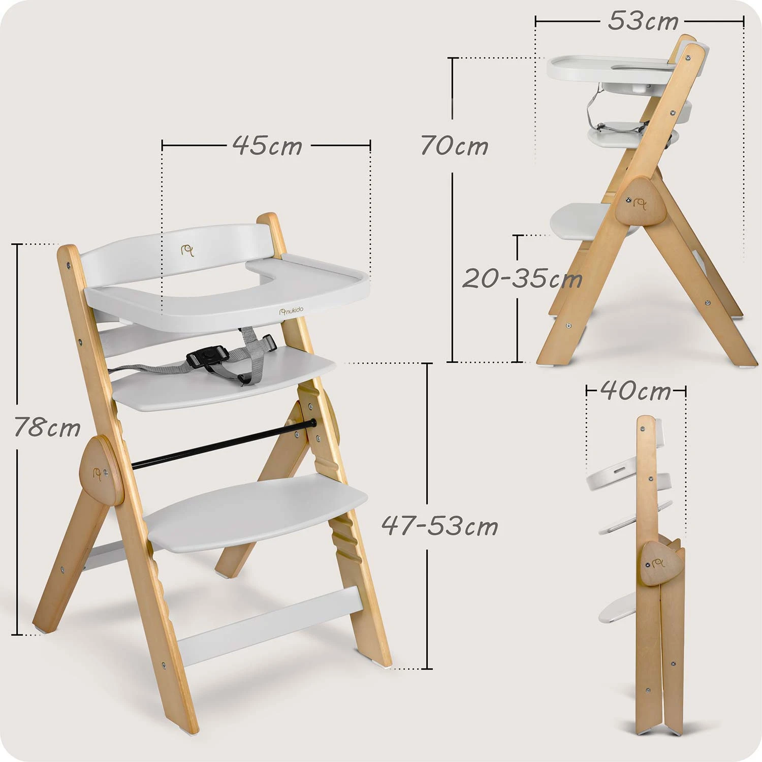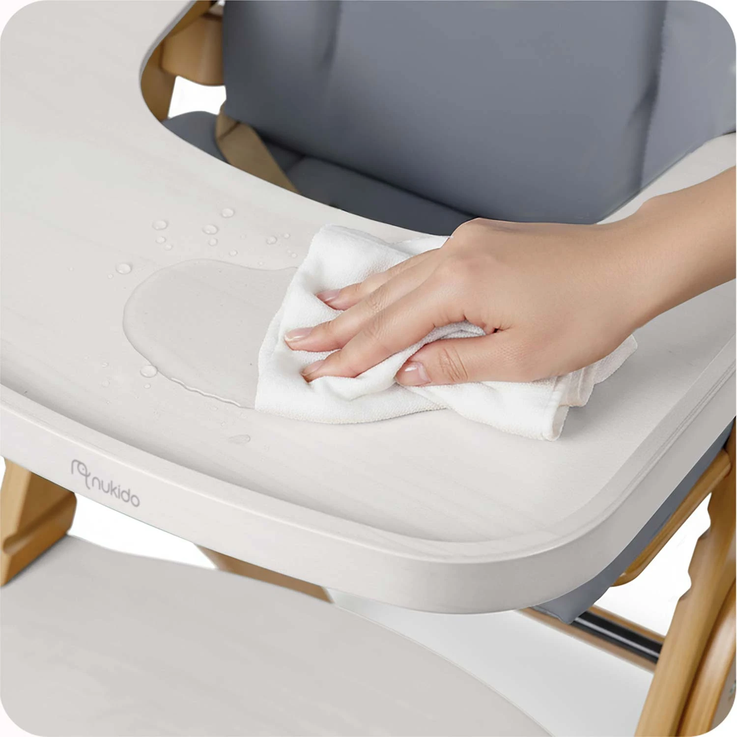 Zdejmowana tacka znacząco ułatwia utrzymanie czystości. Lakierowane drewno topolowe to gwarancja jakości. Zabezpieczone drewno nie pozwoli pochłonąć plam i krzesełko szybko wróci do perfekcyjnej czystości.