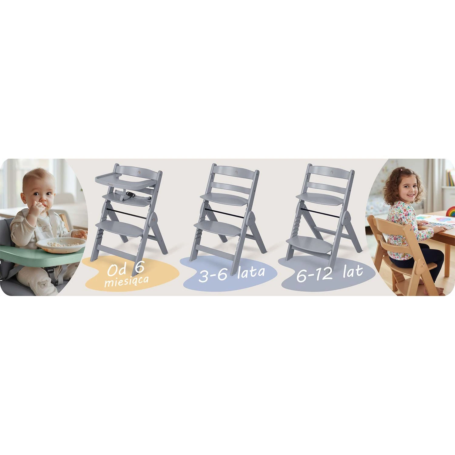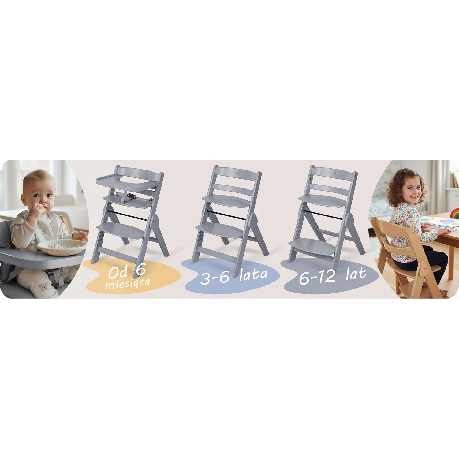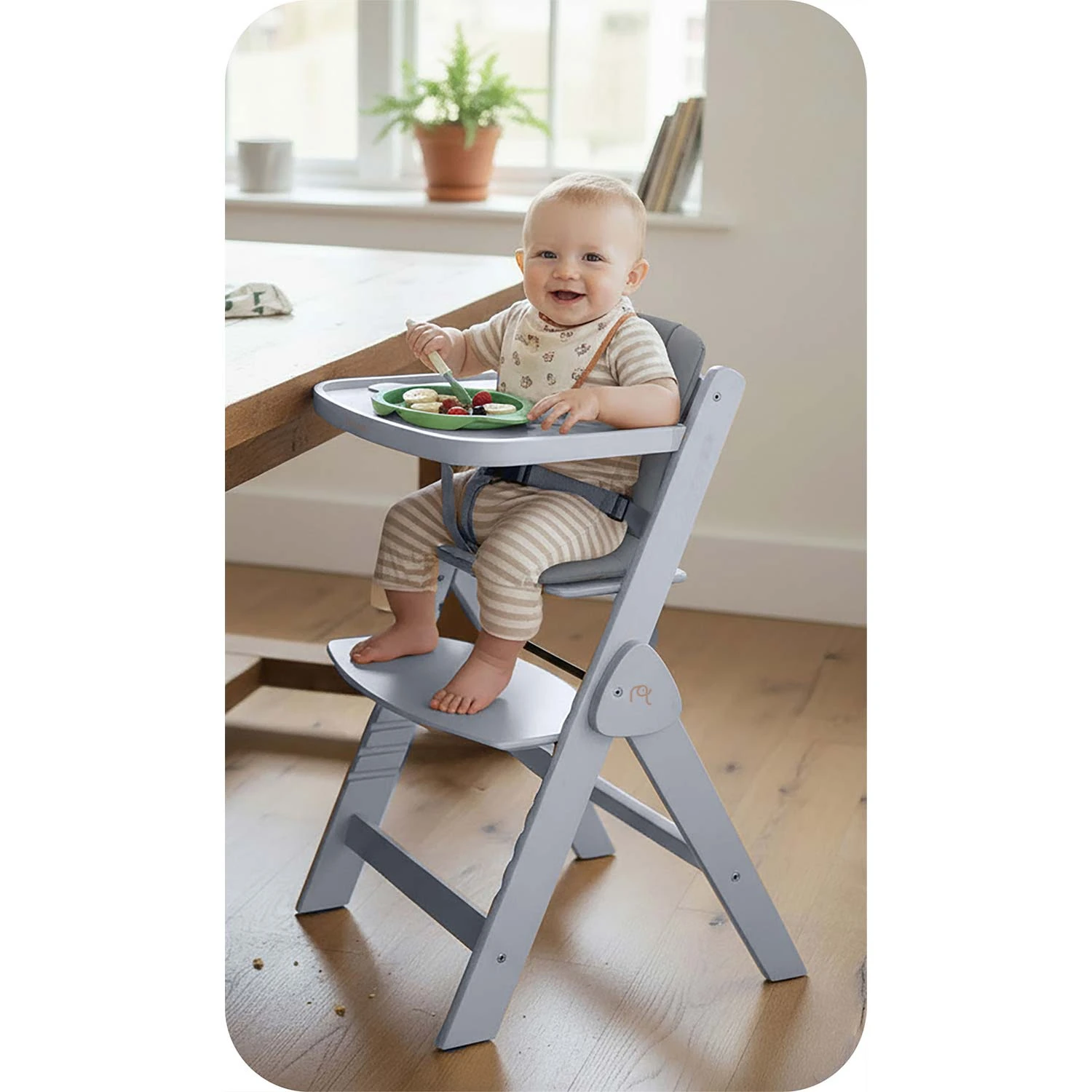 Dzięki specjalnemu zestawowi z pasami bezpieczeństwa i wygodną poduszką staje się bezpiecznym i komfortowym pierwszym krzesełkiem dla Twojego maluszka. Idealne do pierwszych posiłków i wspólnych chwil przy stole.